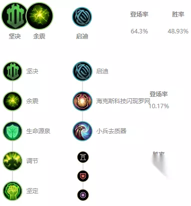 推荐:坚决+启迪(余震) 推荐思路:余震可以在你定身住一名敌方英雄之后可以获得双抗的提升,随后这些提升的护甲会爆炸,并对周围敌方英雄造成伤害。