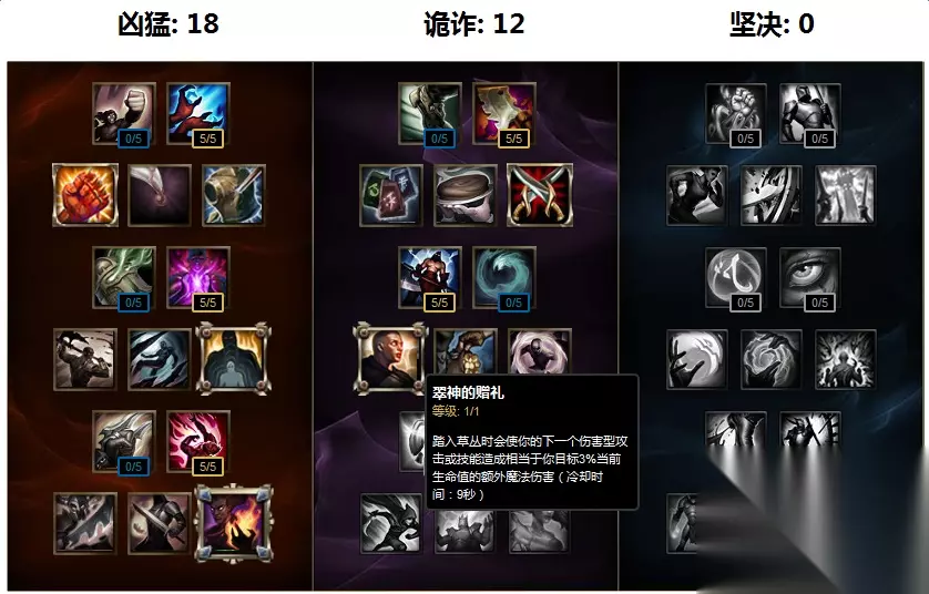 小编提示: LOL每个赛季天赋改动都很大,S8赛季的符文系统也将进行改动,所以233乐园小编在这里为大家带来豹女S8赛季的天赋符文加点以及出装攻略,我们会保持更新最新的内容! 豹女S8天赋加点图 这里采用了18-12-0的加点方法,豹女豹形态的Q是可以触发新鲜血液效果的,加上新天赋翠神的赠礼,使得豹女野区入侵能力进一步加强。
