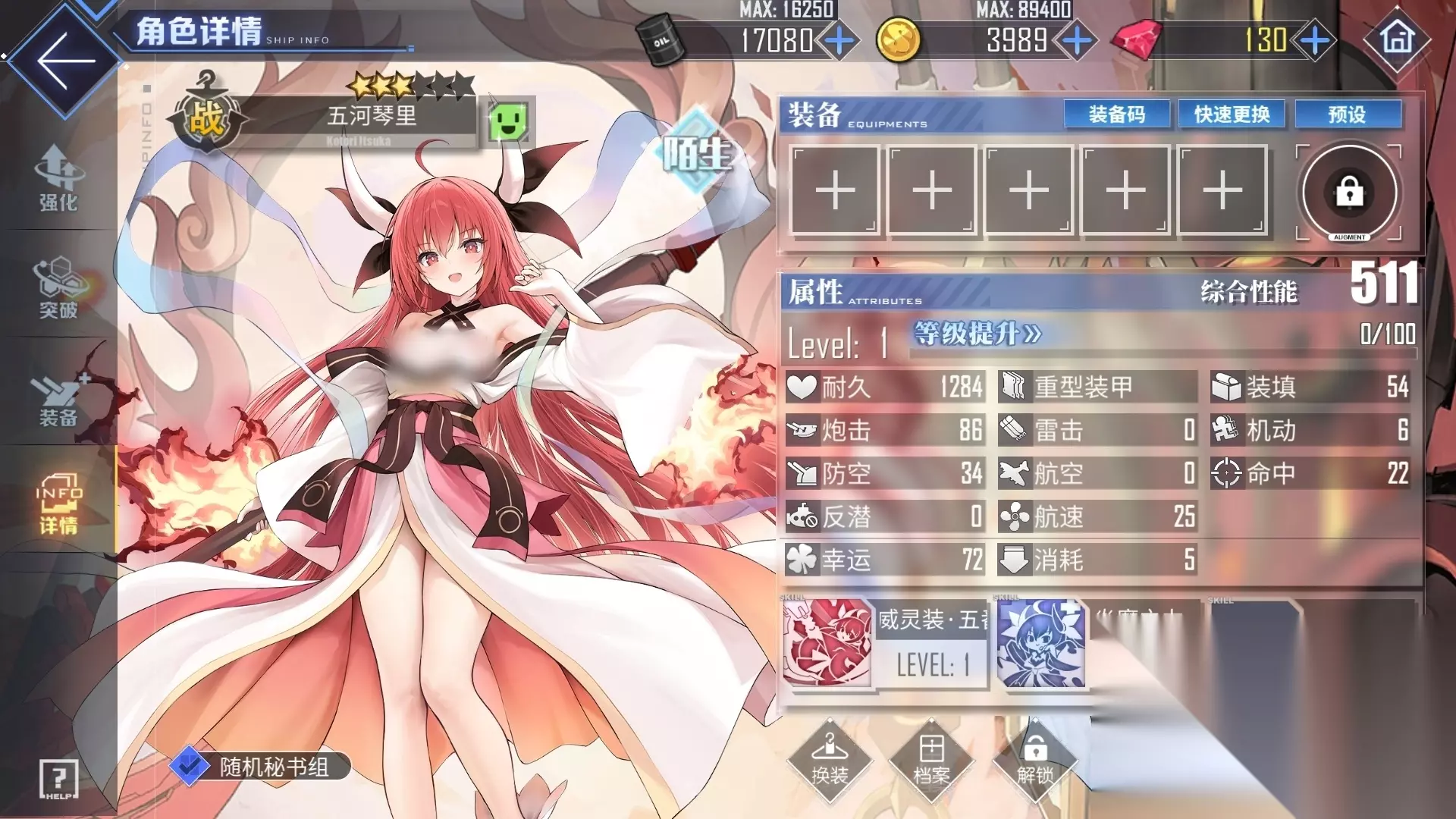 她的另一个核心技能名为炎魔之力,在未装备专属兵装的情况下,能够减少自身受到的点燃类伤害,并且当遭遇致命伤害时可免疫此次攻击,同时进入持续10秒的无敌状态,此效果每场战斗仅触发一次。此外,一旦敌方单位进入其防御判定范围,五河琴里便会自动获得减伤增益,大幅提升战场生存能力。若装配了专属兵装,该技能将进一步强化:不仅提升自身的炮击属性与防空性能,还能在触发免死机制后为自身恢复一定量耐久值,进一步增强续航。