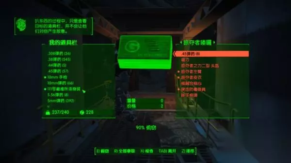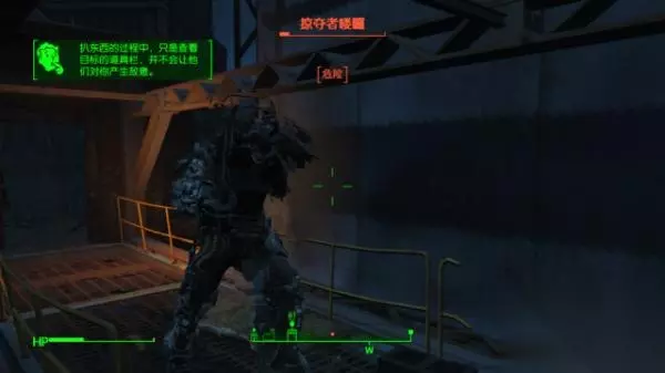 安装有头灯的动力甲,探测距离明显提升。 如果是晚上进行行动的话,一定要观察目标是否有头盔,是否有头灯。 5、试探你的目标 接近之前可以试探你的目标探测距离,潜行快速接近目标看警戒的距离,然后脱离,估算大致目标警戒距离。之后再次接近至上次警戒距离,这次不要被发现,存档,提前切慢速,然后接近,具体从正面背面是没有关系的,之后看其警戒距离。如果不能接触到目标身边就引发警戒,读档使用第二方案。 第二方案:使用隐形小子。如果不是专门点敏捷的潜行perk,接近起来本身就很有困难,所以到达快速接近警戒距离时使用隐身小子之后切走路接近,看能否到达可以偷窃的距离而不被察觉。注意潜行两个字旁边的两个框,如果其快速向中间移动,就不要一直按着移动,稍微蹲一蹲,让框保持不要接触到字可以延缓被发现的时间。但是如果仍然不能到达扒窃距离,没关系,我们还有第三套方案。 第三方案:专门对付拥有头灯或者疑似拥有探测模块的敌人。