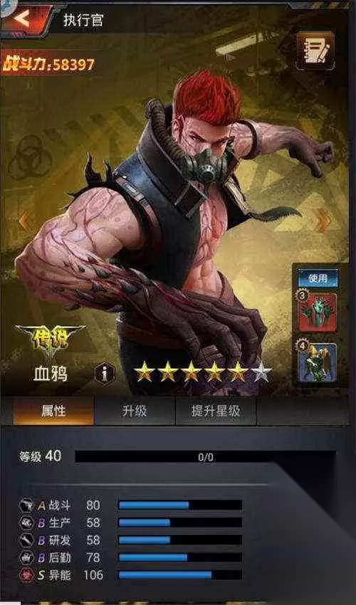 研发属性能影响科技研发速度,因此在任命科研官时主要看研发属性,赛斯博士和黑杰克的研发属性最高都可达104,都是作为科研官不错的选择但是由于赛斯博士的被动“研发加速”,满级时可以减少研究科技所需时间25%,因此有赛斯博士的指挥官们可以优先将其指派为科研官。 (图4) 异能执行官的异能属性及其生化技能是《末日进化》手游中的一大特色,异能属性的高低关系到丧尸病毒兵的出征数以及伤兵的升级数。异能执行官中帅气的血鸦是不错的选择,最高异能属性可达106,在医治士兵时可以有9.2%的几率使士兵升级,可以说是指挥官们越级拥有高级兵的必备执行官了。