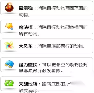 【主动道具】: 在游戏关卡和挑战模式屏幕底部的5个道具为主动道具,主动道具可以帮助玩家快速过关。 1. 霹雳弹道具:霹雳弹道具可以消除目标动物周围两圈范围的动物。点击屏幕底部的霹雳弹道具图标后,再点击任意动物使用该道具。 2. 魔法棒道具:该道具可以消除与目标动物相同颜色的所有动物。点击屏幕底部的魔法棒道具图标后,再点击任意动物使用该道具。 3. 大风车道具:该道具可以消除最底下两行的动物。点击屏幕底部的大风车道具图标使用该道具。 4. 强力磁铁道具:该道具可以把悬空的动物拉到底部,并触发动物的消除判定。点击屏幕底部的强力磁铁道具图标使用该道具。 5. 天旋地转道具:该道具可以把的动物全部移动到顶部再下落,并触发动物的消除判定。点击屏幕底部的天旋地转道具图标使用该道具。