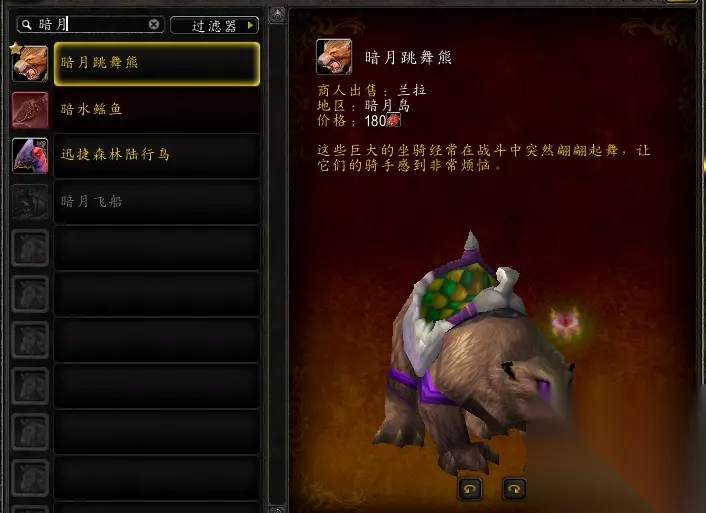 今天我带大家攻略两只还算挺好看、价格很平民的坐骑:暗月跳舞熊、迅捷森林陆行鸟: