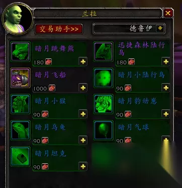 大家可以看到,交了这个任务直接会获得10张暗月奖券。九种物品我就不一一上图了,这里告诉大家分别都给多少张奖券:怪异的蛋10、灌魔水晶10、神秘的魔典10、占卜者符文10、战略论10、精美的武器10、阵亡冒险者的日记5、阵亡者的旗帜5、收缴的徽记5,这九种物品都交上去一共能获得75张暗月奖券,加上第一次去马戏团那5张,OK,正好180张。 此时我们有180张奖券了,可以直接去找下图位置的NPC购买坐骑: