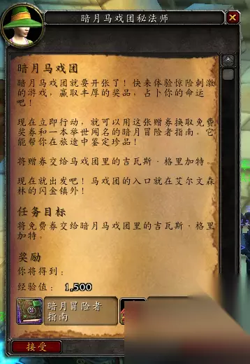 接了这个任务,我们来到了暗月马戏团,先把这个任务交了。 使用上述九种物品,这九种物品分别提供一个任务: