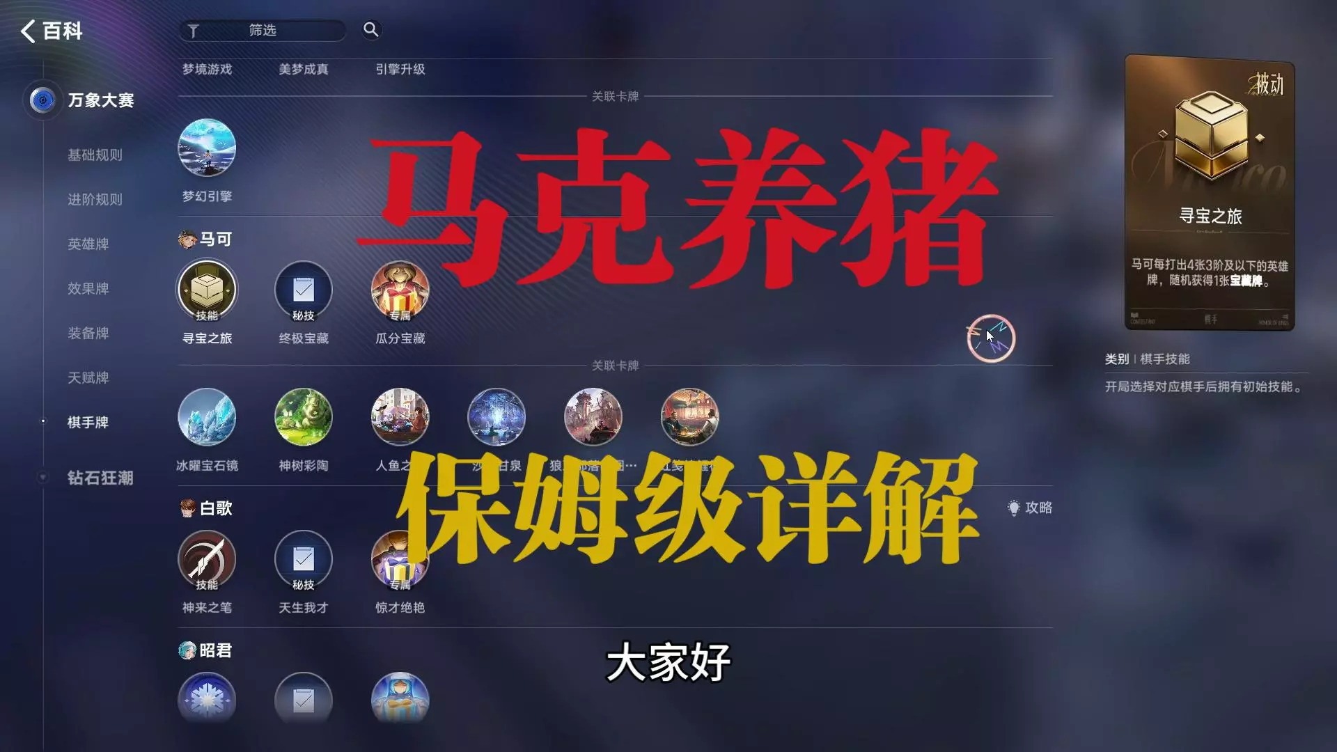这是一期王者万象棋的游戏解说,对游戏里全棋手的技能、秘笈、专属天赋进行了详细讲解,展示了玉环、马可、镜等多位棋手的相关内容,帮助玩家挑选心仪棋手开启游戏之旅。