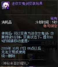 效果介绍: 使用后,可以变身为迷你女鬼剑,效果持续5分钟。变身状态下,提升10%的城镇移动速度。