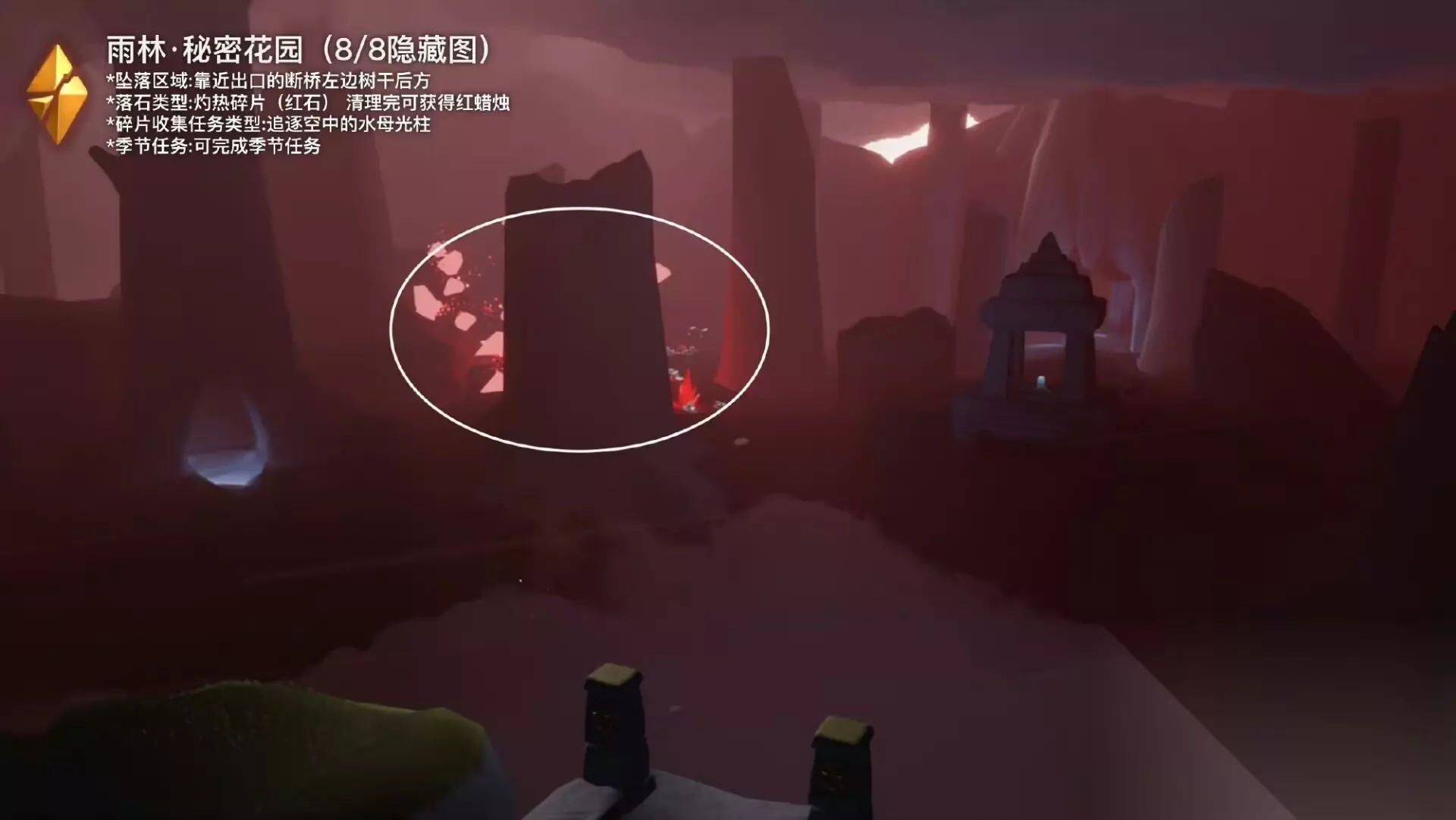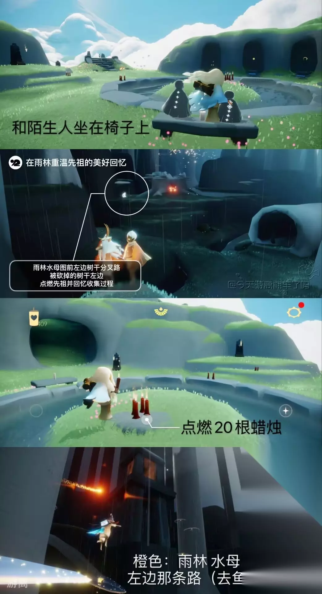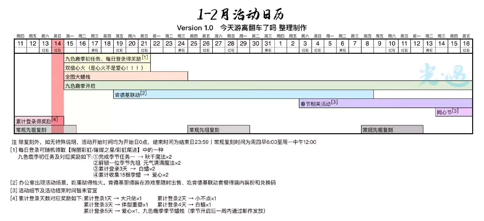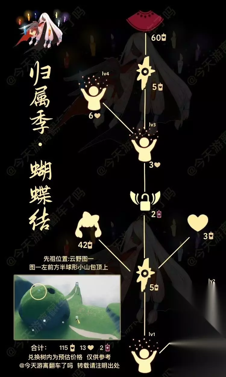 图1 今日任务详解 图2 今日大蜡烛点(雨林暮土禁阁) 图3 可能的落石点(图示位置随机出现一处 图4 本周四复刻先祖预估兑换树 图5 本周四复刻先祖动作展示 图6 近期活动日历 =『每日任务』=季节空窗期每个任务给1白蜡 「和陌生人坐在长椅上」字面意义 「在雨林重温先祖的美好回忆」雨林水母图前左边树枝分叉路,被砍掉的树干左边 「点燃20根蜡烛」 「收集橙色光芒」雨林水母图前左边分叉路(高台小金人附近) =『落石点』= 今日落石点:(红石)雨林8/8隐藏图 可完成破晓季节任务、奖励红蜡 降落时间: 7:08-8:00、13:08-14:00、19:08-20:00 =『日程提醒』= .遇境魔法船免费魔法: (每周日)绚丽彩虹、体型重塑 .九色鹿季将于1.15日更新结束后开启 .归属季彩纸表亲先祖将于下周一中午12:00离开