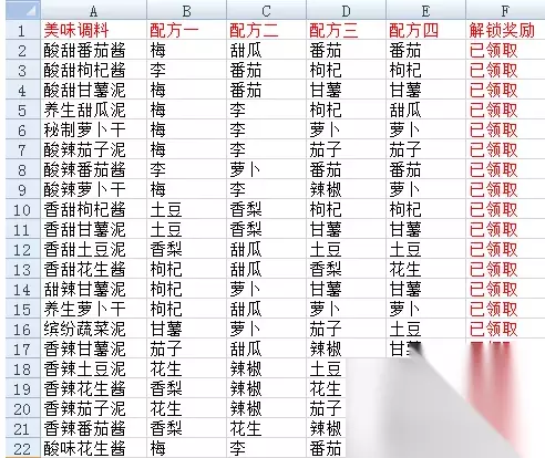 新版烧烤调料配方 1、酸甜番茄酱,梅、甜瓜、番茄X2 2、酸甜枸杞酱,李、番茄、枸杞X2 3、酸甜甘薯泥,李、番茄、甘薯X2 4、养生甜瓜泥,梅、李、枸杞、甜瓜 5、酸辣茄子泥,梅、李、茄子X2 6、酸辣番茄酱,李、萝卜、番茄X2 7、酸辣萝卜干,李、梅、萝卜、辣椒 8、秘制萝卜干,梅、李、萝卜X2 9、香甜枸杞酱,土豆、香梨、枸杞X2 10、香甜甘薯泥,土豆、香梨、甘薯X2 11、香甜土豆泥,香梨、甜瓜、土豆X2 12、香甜花生酱,枸杞、甜瓜、香梨、花生 13、甜辣甘薯泥,枸杞、萝卜、甘薯X2 14、养生萝卜干,枸杞、甜瓜、萝卜X2 15、缤纷蔬菜泥,土豆、甘薯、萝卜、茄子 16、香辣甘薯泥,茄子、辣椒、甜瓜、甘薯 17、香辣土豆泥,花生、辣椒、土豆X2 18、香辣花生酱,香梨、辣椒、花生X2 19、香辣番茄酱,花生、辣椒、香梨、番茄 20、香辣茄子泥,花生、辣椒、茄子X2 21、酸味花生酱,梅、李、番茄、花生 新版烧烤活动流程 新版烧烤共有四个小游戏,每次烧烤随机选取三个。