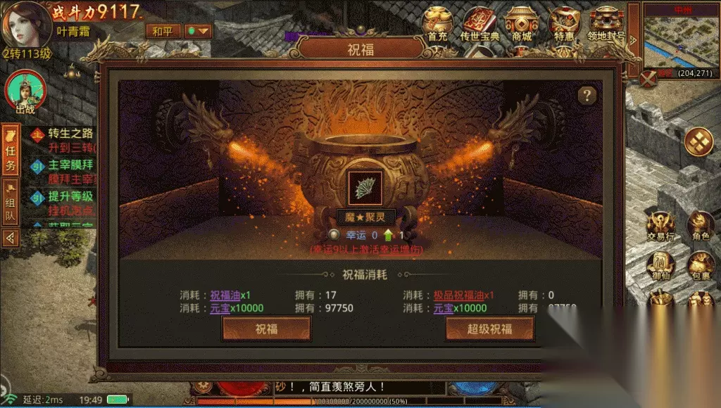 这个时候霜霜就想着要不先提升一下自己的实力?于是一番查找下,装备强化系统进入了眼帘。 好家伙,一看之下点开装备选项,不仅有强化,还有祝福、合成、炼圣炉,可谓进阶方法多种多样。 强化: 这个相信玩过类似游戏的小伙伴都知道,先选装备,然后加入矿石融合增强属性即可。强化石可以商城买,也可以刷怪掉落,大家刷到了可千万别丢呀! 祝福: 祝福油只有野外怪物会掉落,更好的极品祝福油则只有八卦炉才会出。 祝福油使用到装备上之后,会增加幸运值,幸运值高的话,攻击幸运值比自己低的玩家可以造成额外10%伤害哦~是出门打架的不二之选!