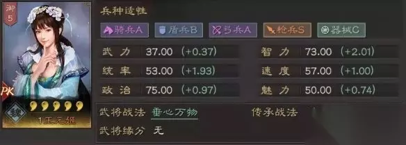 2.王元魏骑2 (主)曹操:军民+草船 (副)王元姬:刮骨+象兵 (副)夏侯渊:百骑+速乘/暴戾 3.孙权肉枪 (主)孙权:当锋/兵无/�_目/血刃 (副)程普:军民+草船 (副)王元姬:锋矢阵+暂避/白��/大戟士 以上三支队伍个人更推荐张辽、夏侯渊、王元姬这队阵容,虽然可能会被盛气凌敌克制,但就目前战场大环境来看,盛气凌敌大概率只出现在西凉铁骑和锦帆军中。而这两支队伍皮肤耀眼,很容易被识别,只要避开他们,王元魏骑必将所向披靡。 二、兵书搭配 理论上王元姬四类兵书都可以选择,自身属性并不差,可输出可辅助,主要还是因地制宜。 辅助单核:九变、军形 输出辅助:战作、虚实 加点建议:全智力 三、武将解读 在属性上,结合女性、辅助将等特点,智统速基础值虽然不高,但已经算相当不俗,完全可以看作谋略版的关银屏。 在兵种上,枪S弓骑A。盾兵通常是肉队的代表;在攻击性上,枪骑弓才是输出的典范,因此不管是依靠宝物的进一步提升,是武锋阵,还是魏营本身,这个兵种适性让王元姬显得无比的百搭。 因此推荐抽到王元姬的玩家别先分解,留一个比较好。