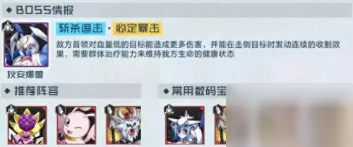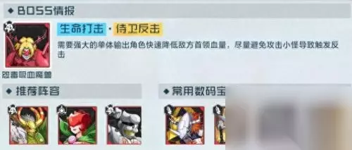 在水域战士关卡中,BOSS对血量低的目标可造成额外的伤害,并且在击败目标时拥有连续收割效果。这个关卡的挑战核心就是利用全体续航保证队伍血线健康,再用单体爆发高的数码兽集火秒掉BOSS。 二、挑战策略