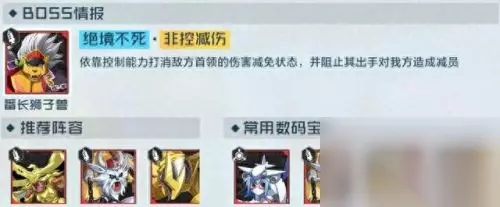 2.BOSS每3回合都会大幅度提升50%的攻击,BOSS的爆发会变得越来越强。这个关卡全力集火BOSS就行,不用去管小怪。但由于小怪也会打伤害,所以除了配置单体爆发的数码兽以外,还建议配置续航、复活型数码兽保证队伍血线。 三、数码兽推荐 1. 番长狮子兽