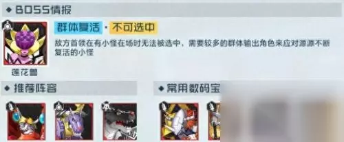 在花香阵地关卡中,敌人首领会利用存在的队友掩护自己。如果场上有小怪存在,BOSS会处于无法选中状态。这个关卡中,可以选用AOE伤害高的数码兽优先清理小怪,也可通过“不选中”首领的技能对其造成伤害。 二、挑战策略