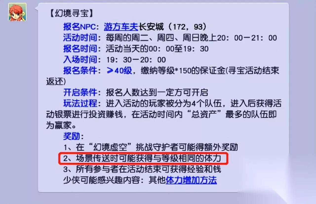 顶级的房屋,可回复18次体力。175级满健身术角色,累计可回复702点体力。 方法4:参与幻境寻宝玩法回复体力 幻境寻宝是一个相对冷门的玩法,需要至少20个人报名才会开启,所以平时参与的人很少。 但参加幻境寻宝,每次移动都有几率获得体力活力,且在场景传送时有可能获得与等级相同的体力。等级越高,收益越好。