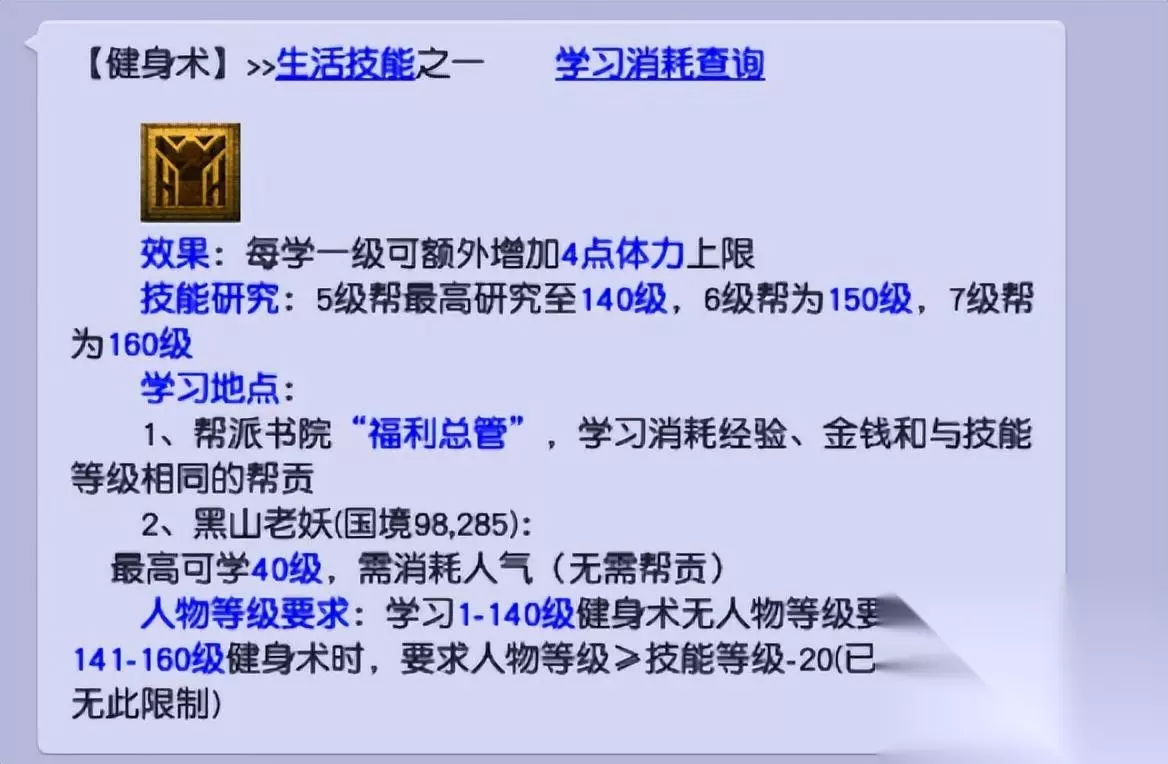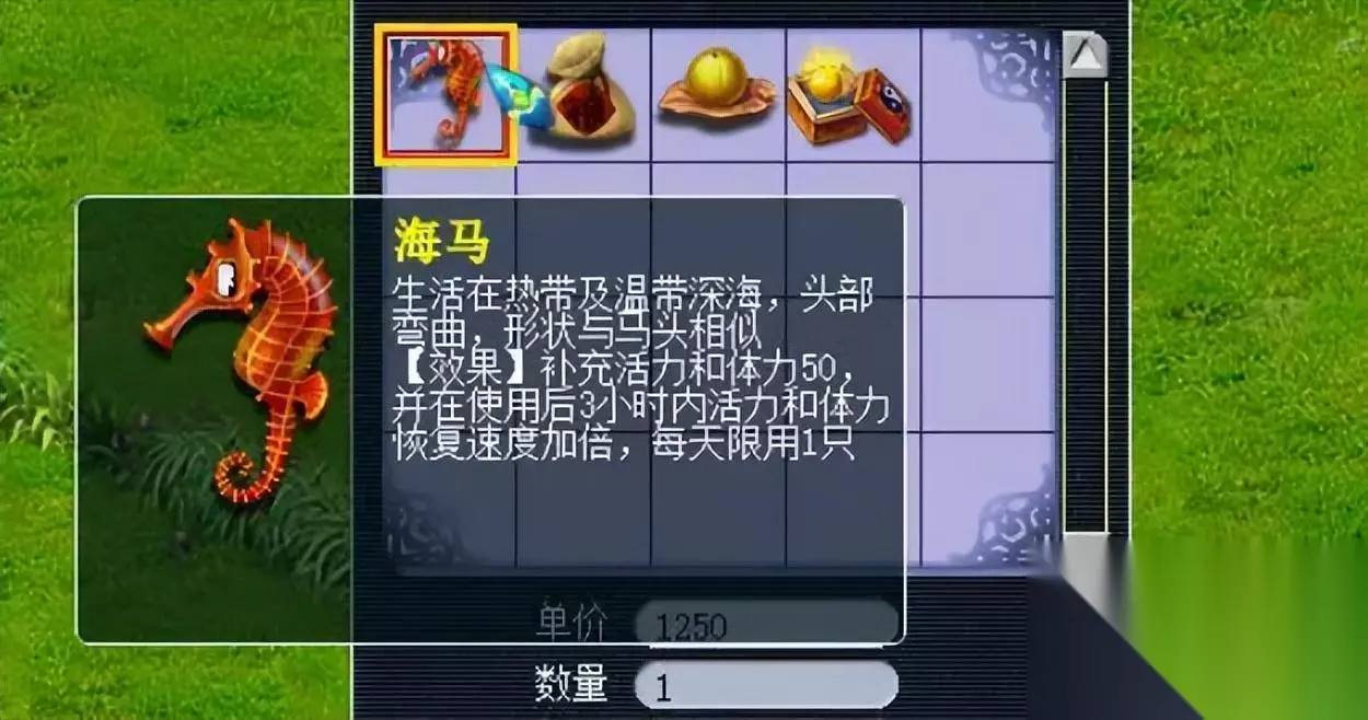 以175级角色,满健身术为例,其体力上限可达到1565。每5分钟可自然回复的体力为21点。 即不考虑其他回体情况,175满强身术角色每24小时,只靠自然回体就能获得6048点体力。 方法2:使用海马和百岁香补充体力 使用海马可立即补充50体力和活力,并在使用后三小时内,使角色自然回复体力和活力的速度加倍。 使用百岁香,可立即回复百岁香品质*2+150的体力和活力。