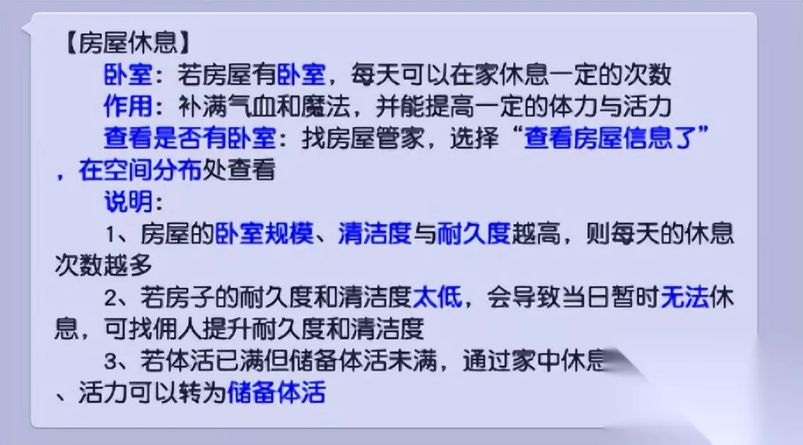 海马和百岁香,每个角色每天限用一个,是教师节活动期间的每日必备补品。 175级满健身术角色,每天使用海马和140品质的百岁香,共可获得1236点体力。 方法3:房屋休息回复体力 角色的房屋若有卧室,可以在家休息,补满气血和魔法,并回复一定的体力和活力。 房屋休息的次数,以及回复体力活力的数值,与房屋规模、房屋风水、卧室数量、房屋清洁度、耐久度有关联。 想要回复更多的体力,有条件的玩家,可以考虑更换成高规模、风水好、多卧室的房屋。 而不需要换房屋的玩家,则需留意房屋的清洁度与耐久度,勤勤打扫修缮,以求将房屋回复体力的效果最大化。