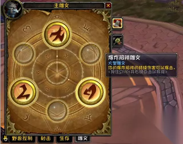 生存猎的大型雕文建议选择爆炸射击雕文、毒蛇钉刺雕文和爆炸陷阱雕文,小雕文可以随意。 然后说一下生存猎人的属性优先级,命中>敏捷>暴击>攻强>破甲>急速 首先需要满足8%的命中,换算成命中等级是263命中等级,然后命中及格后,狂堆敏捷和暴击,所有石头除了出多彩宝石效果的2个宝石,其他全部无脑插红色敏捷,二级词条优先选择暴击和攻强高的装备,破甲属性虽然有用但是前期难堆,所以随缘就好,急速属性对生存猎价值最低,属于最低优先级。 聊完属性优先级,配装就简单了,这里给大家一套P1阶段生存猎的毕业配装,大家可以参考。 头部:蓝色龙神头盔。