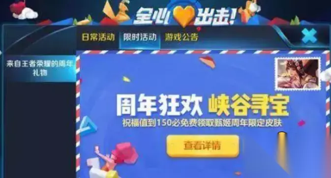 活动时间:10月23日~10月31日 若活动面板上,未找到限时活动,则代表该区域尚未推送该活动。这个时候别慌张,可上贴子,部落,群之类的社群,这类社群刷满峡谷寻宝活动的分享,点到为止即可参与,或者直接向朋友要。 挖宝时必须用刷新卡把宝藏刷到传说中才能挖到,从而得到5点祝福值,在一天内挖到5个宝藏会得到20点祝福值,5个宝藏可同时挖到。帮朋友挖宝还可以得到祝福值,据说宝藏1次为2点祝福值,1天帮10次为20点祝福值,加起来一天最多可得到45点祝福值,只要四天即可满足150点祝福值的要求,在10月26日10点便可以兑换游园惊梦了(游园惊梦价格为710点券,如果你害怕困难的话小伙伴们可以直接买到)。 王者荣耀游园惊梦这个皮肤还是很容易获得的,但是如果不去游戏里面实战获得刷新卡,那相对就很困难了。 以上是小编为各位带来的全部内容,更多精彩游戏资讯,请持续关注 【小编推荐】专区入口 || 视频站入口 || 体验服申请入口 || 全民竞猜赢好礼 【新英雄爆料】| 司马懿 || 瑶 || 孙策 || 新英雄:囚徒/书圣/瞬 | 【新皮肤爆料】| 李白团战皮肤:敏锐之力new || 诸葛亮团战皮肤:掌控 || 典韦穷奇皮肤 Hot!! | 王者荣耀最新攻略 赛季段位继承表 每日一题 边境突围玩法攻略 体验服爆料