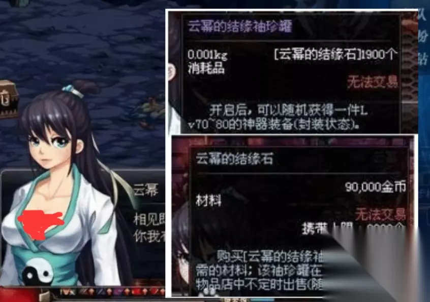 云幂除了卖一些极品装备之外,还有各种的罐子和道具,其中这个云幂的结缘袖珍罐最为特殊了。这个罐子可以说是地下城史上最难得到的罐子,刷五千次图才有资格买,价格高达两亿。这个罐子直接花钱是买不到的,要想获得这个罐子必须得要用1600个云幂的结缘石兑换,每一次只能在云幂那里买到一块结缘石。 而当年大家平均刷三次图才能遇到一次云幂,也就是说大家需要刷五千次图才有可能集齐1600个结缘石。并且这个结缘石还不便宜啊,一个就要九万金币,这缘分也太贵重了吧。也就是说这就需要花费近两亿金币买这些结缘石才能兑换到这个罐子,这代价也太高了点吧。