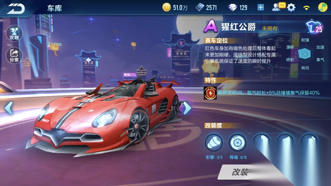 猩红公爵在目前的A车中是没有任何排面的,而且升级顺序并没有太明确一定是先出的车就会先升级,所以这种猜想很有可能成立!最后就是升级后赛车魅影王爵的特性猜想,如果是这两辆赛车进行同时升级,根据黑夜和黑闪升级成黑曜的特性变化,应该是采用暗夜伯爵的特性进行升级,触发条件不变,概率和收益增加。或者是在原有的基础上做一些改良,然后加入动力特性提升或者速度特性提升。当然的,这些都是未确定,唯一确定的是暗夜伯爵会升级成魅影王爵,猩红公爵很有机会,最后祝大家游戏愉快啦。