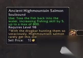 恶臭海蜗牛 把恶臭海蜗牛扔进水里会获得一个2分钟的buff:可能会吸引卓格巴尔。 在钓鱼的时候有几率刷新一个卓格巴尔怪。击杀以后会掉落一个鱼饵:鲑鱼诱饵,有几率在至高岭钓到稀有鱼。 目前测试,基本都是钓到这个:远古至高岭鲑鱼。把这个鱼丢到水里,可以使你的钓鱼技能点数的+5(升级用还是不错的)。