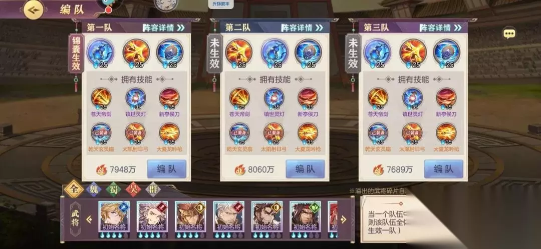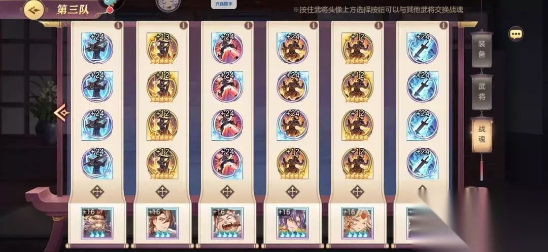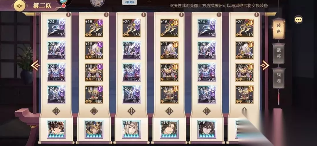 三、阵容搭配 接下来我们谈一谈平民的阵容搭配,配合这一期的锦囊,我推荐平民选择主阵容 切后阵容 女团阵容。 主阵容自然不必说,是我们队伍中的“上等马”。而切后阵容神将相对较少,主要是孙尚香和公孙瓒,但是这两者都是可以被代替的,因为切后卡并不少,太史慈 张颌 夏侯渊组成的切后尽管效果差了些但是由于火度高反而效果会更好。同时切后就是专为PVP对战的,往往能起到越战效果。