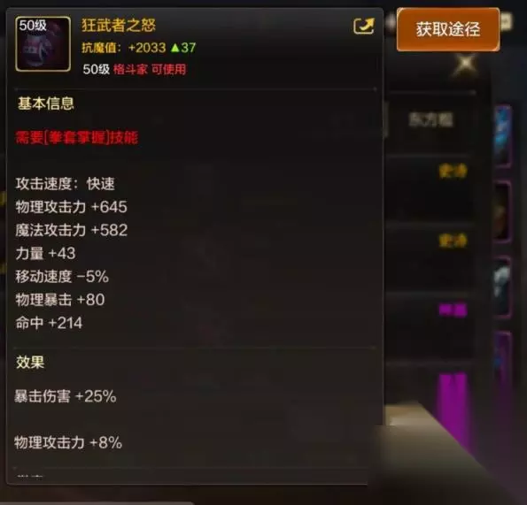 dnf手游狂武者之怒怎么获取: 1、装备属性 基本属性:物理攻击力+645,魔法攻击力+582,力量+43,移动速度-5%,物理暴击+80,命中+214 特殊效果: ①暴击伤害+25% ②物理攻击力+8%