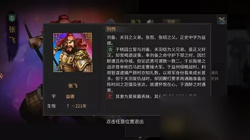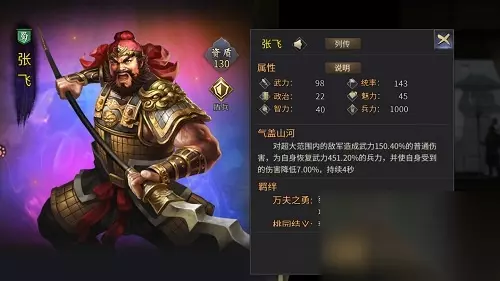 先来看看张飞的各项基础属性。盾系武将,武力98,统率143,政治22,魅力45,智力40,兵力1000。高武力值让张飞拥有强大的个人战斗力,而极高统率值让张飞统率的部队也拥有了极高的作战能力。