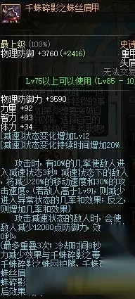 千蛛碎影之蛛丝肩甲 削防是个很强大的属性,千蛛肩膀的减速触发并不困难,很多人有一个误观念就是20人装备削防无效,事实上固定扒防是有效的,只是百分比削无效,因此这个装备完全可以带着打团,如果队伍里有削防职业这件装备收益可能被放大很多,具体削防收益变化参考教主神贴。千蛛肩削防可以全程,12000~24000不等,强散之一。