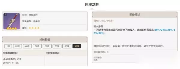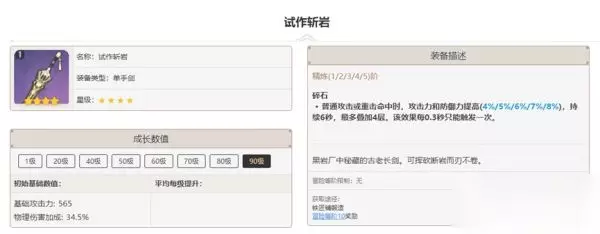 如果上述武器都没有,也可以考虑使用4星锻造武器「试做斩岩」,副属性提升34.5%物理伤害、效果可以稳定叠32%攻防,可以进一步提高伤害基值。不过伤害提升比匣里龙吟稍逊一筹,故不作为主要推荐。