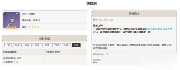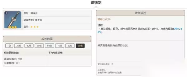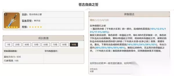 其次推荐「苍古自由之誓」与「暗铁剑」。苍古能提供最高额的元素精通,超过一个元素精通圣遗物,并且能为自己和队友带来攻击辅助,如果有当然是铁蜂刺的上位替代,如果没有,33点元素精通差值可以忽略不计。