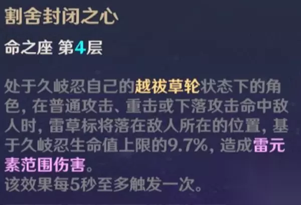 久岐忍的第4命之座会追加低频(5秒/次)雷元素范围连携攻击。可以用于配合水、火、冰系角色打出各种距离下的元素反应,比如:配合宵宫/安柏的火矢触发连续超载爆炸,打出类似DNF里的押枪操作(大雾)。 四、特色机制-绝不倒下 久岐忍的第六命之座技能效果与胡桃类似,在受到致死伤害时锁一次1血。此外,生命值降到1/4血线下时,可以提升自己150元素精通。一定程度上提高了久岐忍的生存率。 该效果也可以用于全队没有大招无敌帧可用的时候,替其他角色挡一次必死伤害。(万叶&友人:如果当初认识你……) 综上所述,久岐忍这位4星角色的职业发展路线是: 0~6命:挂雷工具人/感电手、治疗位、双雷共鸣挂件、站场主C 4命:挂雷频率提升 6命:替死肉盾 配队与出装 由于久岐忍就业面广阔,本章节针对「治疗师」、「电疗师」、「剑圣」、「元素剑士」四种定位进行推荐。 一、治疗师 久岐忍的治疗量与生命值上限正相关,想要成为一名合格的治疗师,需要尽可能地抬高小忍的生命值。 【武器推荐】 对于治疗师小忍,武器只有两种:「磐岩结绿」和「其他单手剑」。因为对于生命值具有增益的只有五星限定武器「磐岩结绿」,提供20%生命值加成,并且基于生命值转化机制以及高额的暴击率,可以成为小忍在任何就业岗位的毕业武器。