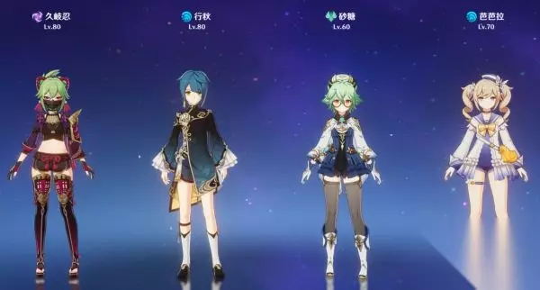 岐秋糖芭 感电队,全4星平民配置,对武器,圣遗物都没有很高要求。主打感电伤害的同时,双水共鸣还可以大幅提升队伍里3位奶妈的治疗效果。砂糖的定位主要是降低雷抗、提高雷伤,聚怪,以及增加元素精通。 队伍由久岐忍e技能挂雷、行秋eq与芭芭拉e挂水,砂糖战场打扩散导电输出;如果芭芭拉装备不灭月华,则可以由芭芭拉战场打输出。 【队友装备】 行秋:祭礼剑+绝缘之旗印4件套(充水暴) 砂糖:万国诸海图谱+翠绿4件套(精精精) 芭芭拉:讨龙英杰谭+少女4件套(生生治)、不灭月华+沉沦4件套(生水暴)
