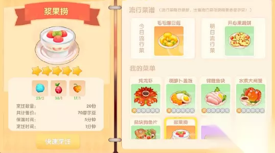 2、红色浆果藏匿于丛林深处,而橙色浆果则可在牧场及淘淘乐街进行采集。 3、在烹饪界面中,玩家需寻得制作浆果捞的食谱。 4、请玩家留意,烹饪此佳肴需时1分钟,保温则需维持5分钟。