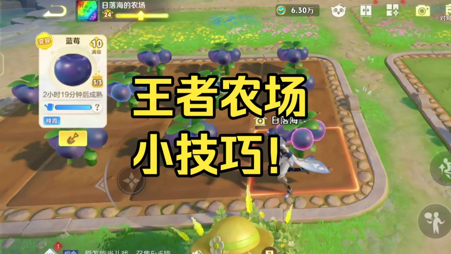 这是关于王者农场的攻略内容,提醒玩家别急着种菜,要先关注右上角的对局奖励,还展示了农场的种植地块、作物以及家园场景,帮助玩家了解新版王者农场的玩法要点。