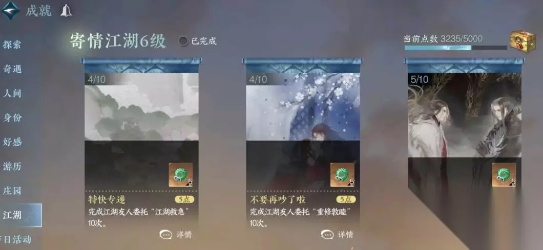 逆水寒手游江湖友人委托攻略 一、五种江湖友人委托成就合集 1、与人为善: 与委托中的NPC增加好感度,最方便的就是给目标NPC送点东西。夸NPC好看有时候会不好使。 2、百机留影: 对着委托中的npc拍一张。 3、江湖救急: 给委托中的npc送指定物品。 由于打字虚空送东西不行,必须送实物。所以建议选简单的东西,有些要送什么考古的玩意儿建议别接了。