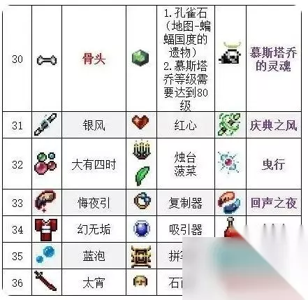 吸血鬼幸存者作为一款肉鸽游戏,玩家在游戏中获得的道具和武器都是能够都是能够合成变成新的武器的。但许多玩家还不知道吸血鬼幸存者武器道具怎么合成?本期坦牛手游就带大家来看看吸血鬼幸存者合成表,在这里大家就能看到吸血鬼幸存者全武器合成表,需要的玩家来看看吧。 吸血鬼幸存者合成表序号武器进化条件超武说明1鞭子空心血鞭范围增加,击中回8血2吸血鞭神圣鞭超吸血鞭致命一击可产生爆炸3经圣拼写器邪恶晚祷无cD4飞刀手套千刃无cD5符文追踪器护甲破坏弹跳和报复时产生爆炸6火焰之仗菠菜地狱之火可穿透敌人77大蒜红心噬魂者伤害增加,命中回血8圣水吸引器|短绒范围持续增长,并跟随你移动9闪电戒指复制器雷环弹射可击中2次10魔杖cd书圣魔仗无CD11法力之歌咒脂酸曼纳迦概率减速敌人12斧子烛台死亡施风向四面八方氨型可以穿适敌人的斧子13十字架三叶草天堂之剑可暴击14五芒星王冠美丽月亮全屏爆炸后吸引周围宝石15非拉图普罗/八雀提拉米苏菲拉吉子弹效果变为可穿透的激光16钻头翅膀火焰喷枪移动时脚下生成移动的火焰。停止移动,火焰变为穿透的激光17苦猫石面具罪恶欲望召唤的猫变为了卡姿兰大眼18白鸟黑鸟破坏者合成后可继续升级19胜利之剑托罗纳的盒子唯一解打败的敌人越多,它就越强大20时钟柳叶刀金戒指、银戒指 1、孔雀石(地图-蝙蝠国度遗物) 2、慕斯塔乔等级需要达到80级慕斯塔乔的灵魂31银风红心庆典之风32大有四时烛台、菠菜曳行33悔夜引复制器回声之夜34幻无垢吸引器乔多尔35蓝泡拼写器虚幻气泡36太宵石面具村正游戏中的隐藏超武1满级君临剑满级托罗娜魔盒(金砖)银河(唯一的超饰品)2满级月桂满级右箭头绯红圣骸布使角色最大只会收到10点伤害,打死神必备,左右箭头可在通过第三关获取黄印后在每个地图的左右两侧刷新3满级寒冰柳叶刀满级金戒指、满级银戒指金银柳叶刀每隔一段时间降低敌人百分之五十的血量,打死神必备,金银戒指可在通过第三关获取黄印后在每个地图的上下两侧刷新4满级恶咒火焰满级托罗娜魔盒(金砖)穆斯佩尔的骨灰 吸血鬼幸存者合成图