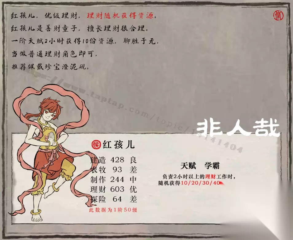 江南百景图红孩儿怎么样 人物属性 初始属性:建造71,农牧18,制作99,理财256,探险15 满级属性:建造428,农牧93,制作244,理财603,探险67 双倍书籍 暂无 天赋-学霸 负责2小时以上的理财工作时,随机获得40份资源。 珍宝推荐 澄泥砚 人物简评 1、红孩儿是个善财童子,他确实很擅长理财,适合放在理财建筑工作;2、一般来说,搭配澄泥砚即可,可以随机多获取一些资源。