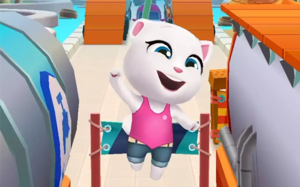 这是《汤姆猫跑酷》的游戏内容展示,呈现了角色安吉拉在跑酷过程中,通过跳跃、变道等身法躲避障碍物、收集金条的过程,展现安吉拉跑酷身法的练成方式。