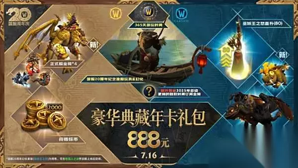 魔兽世界国服全新888年卡礼包公布了,比去年的更豪华,有正式服和怀旧服通用的国服20周年纪念玩具和幻化套装、怀旧服的静水钓客等,一起来看看划不划算吧。