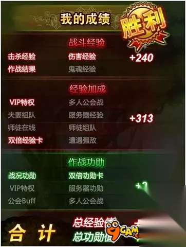 竞技战是获得经验的一个重要途径,这里指的一般是2人以上进行公会战,是效率最高的,大家可以看下图,就可以知道那些因素会影响到战斗后获得的经验。 战斗经验是指击杀经验,伤害经验,作战结果,鬼魂经验,简单的描述就是,你杀的人多,造成的伤害多,最后获胜,就可以获得获得大量的经验。战斗经验就好比是基数,经验加成就是在基数的基础上按比例计算。 经验加成主要有VIP特权,越高级增加的经验值越多,1级的时候增加10%,夫妻或徒弟组队,都有额外的加成,(结婚的另外一方也可以成为徒弟),经验卡和服务器经验,都是按倍数增加的,可以叠加,遭遇强敌指的是遇到对手比自己高5级以上,就可以获得额外的200经验。 如果新服的朋友不是太在乎胜率的,可以进行跨区公会战,基本上每场都能遭遇强敌,可以获得很多的经验的。 2、副本战