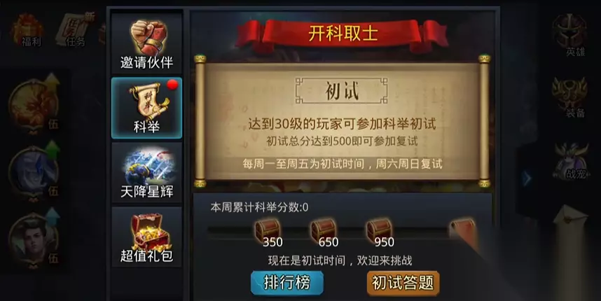 科举玩法属于限时活动,每天8点到24点开放初试,30级以上的小伙伴可以直接从主界面活动入口参与。初试每天能答10道题,题目涵盖文史、游戏知识等,答对能拿角色经验和等级经验奖励。周末还有复试环节,但需要初试累计答对35题以上才能解锁,复试排名前50的玩家能上榜拿特殊称谓和额外奖励。