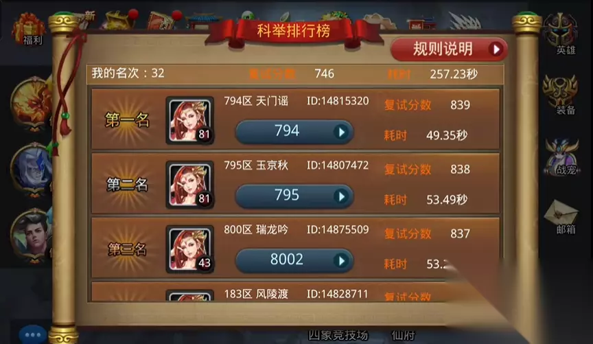 科举玩法主要分初试和复试两阶段,初试是日常答题,复试则是周末的排名赛。复试共30道题,答得越快、正确率越高排名越靠前。前三名能获得状元榜眼探花的专属称号,这些称号会显示在角色信息里。排名数据每5分钟更新一次,只有答完全部题目才会参与最终排名。