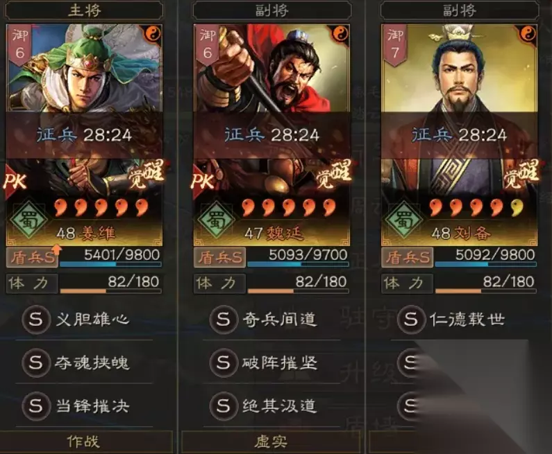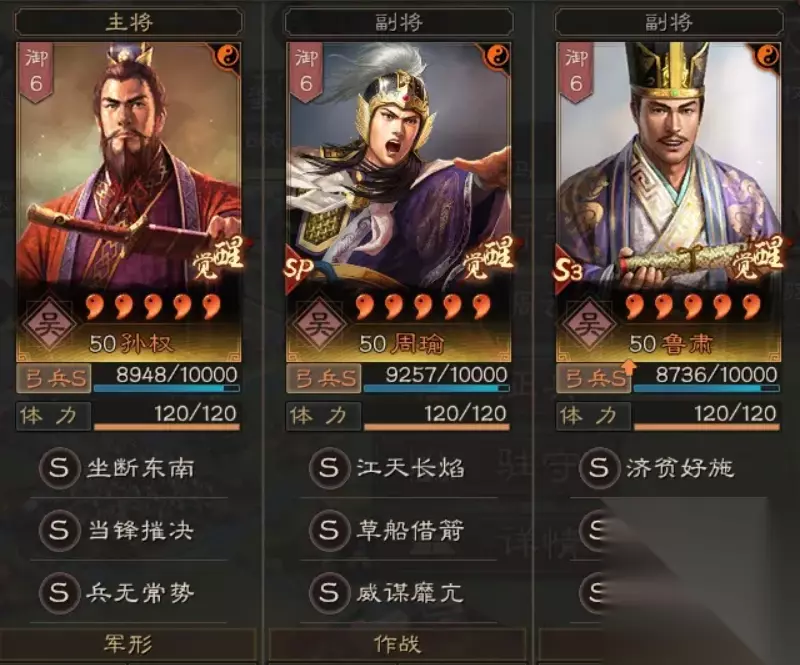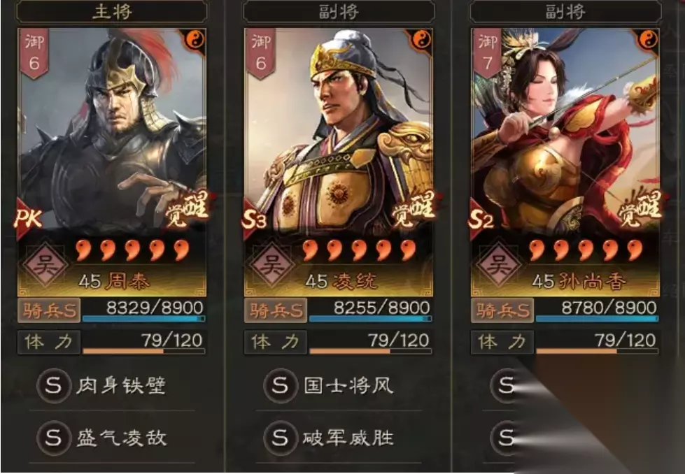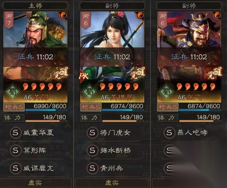 阵容配置: 破军威胜 横扫千军 虚实 以致击乱 神机 鬼谋 折冲御侮 当锋摧决 虚实 以致击乱 神机 将威 盛气凌敌 锦帆军 军形 首尔有道 铁甲 守势