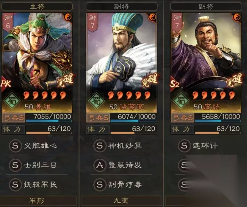 王师剧本剧本信符推荐:鼓吹 英雄集结剧本特性推荐:锐枪-专征 阵容分析: 优势:阵容开荒打地能力优秀,同时其对抗骑兵能力出众,在对抗太史慈弓兵时也可算作优势对局, 同时队伍整体具备震慑、缴械、技穷、虚弱四重控制,在三战这款概率游戏中,经常会有意想不到的战报。 劣势:被群弓克制,队伍整体智力较低,对抗法队时,容错率较低,会被无当飞军以及士别三日克制。主动战法队伍战法释放教为看脸,输出不算稳定。 搭配技巧:踩踏可以触发关妹控制,队伍中有2-3踩踏可以极大提高队伍胜率,同时封册商店赳螑特技,以及货币商店的雄烈可以进一步让此队伍封神。 阵容配置: 顶配 夺魂挟魄 杯蛇鬼车 作战 蛮而非勇 文涛 执锐 太平道法 士别三日 虚实 后发先至 将威 鬼谋 暂避其锋 刮骨疗毒 九变 援其必攻 励军 掩虚 常规共存 姜维:夺魂挟魄 杯蛇鬼车 作战 蛮而非勇 文涛 执锐 庞统:太平道法 无当飞军 虚实 后发先至 将威 鬼谋 诸葛亮:八门金锁阵 婴城自守 九变 援其必攻 励军 掩虚 王师剧本剧本信符推荐:前期候印印绶后期玄弓 英雄集结剧本特性推荐:强弩-专征
