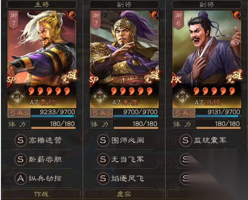 王师剧本剧本信符推荐:前期候印印绶后期玄弓 英雄集结剧本特性推荐:强弩-专征 阵容分析: 优势:群弓前期有着不俗的开荒能力,同时其开区时的作战能力也是一流,对抗各类吴枪,父女枪,机关枪,麒麟弓,快攻骑等都属于优势对局,依靠超长的控制回合和独特的共存体系爆火。即便是满红聚集的航母区,群弓也能让你有不错的体验。 劣势:同蜀弓类似,被太尉盾克制。同时主动战法队伍,面对快攻队伍时,容被爆头。 搭配技巧:sp袁绍速度可以快攻低速吴骑/虎臣弓,sp朱俊速度可以快攻传统法师阵容以及辅助。根据自身红度适当补一定速度可以极大提高此队伍胜率。 阵容配置: 当锋摧决 兵无常势 作战 胜而益强 胜战 执锐 暂避其峰 形一阵 军形 惜兵爱民 铁甲 守势 草船借箭 威谋靡亢 作战 奇正相生 文涛 执锐