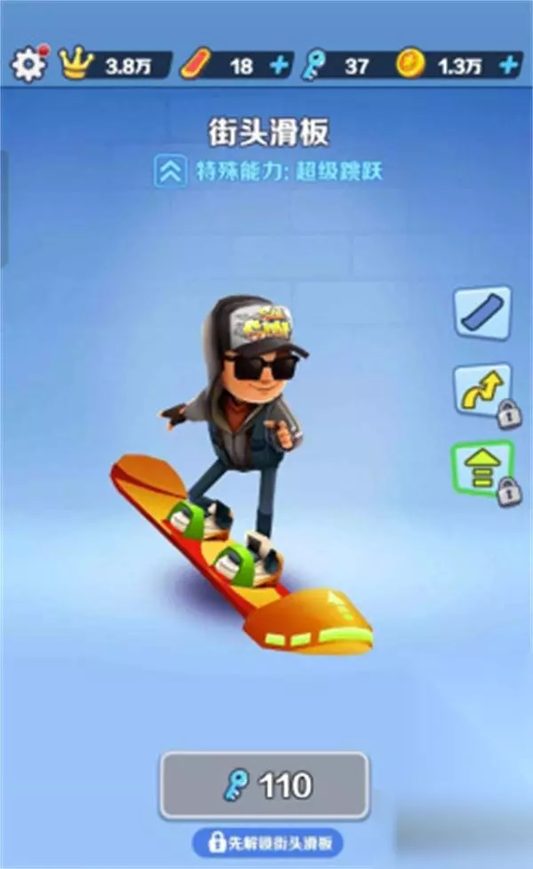 价值45000个金币,花费90个钥匙可以解锁二连跳,花费110个钥匙解锁超级跳跃,滑板上有固定绑带,不用担心杰克会掉下来,滑板头还会发绿光,十分实用。