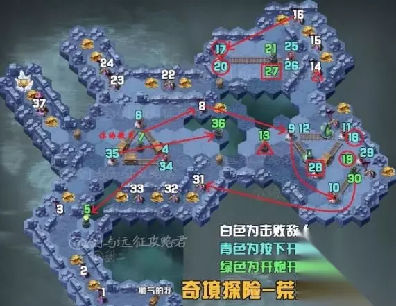 2020年4月9日,开放周年庆活动,以及新奇境图的很多奖励。先放一张剑与远征攻略君的总揽图,方便大家定位。数字码有的叠加在一起了大家不要乱,严格按照数字码顺序走就行!没玩过奇境的萌新小白同学,看图里转盘是点击一下,联动轨道上的箱子移动的机关哦! 白色为敌人,青蓝色为开关,绿色是开炮。如果是新入坑小白,请仔细阅读以下3和4,助你轻松过关得道具!明早8:30更新难点!
