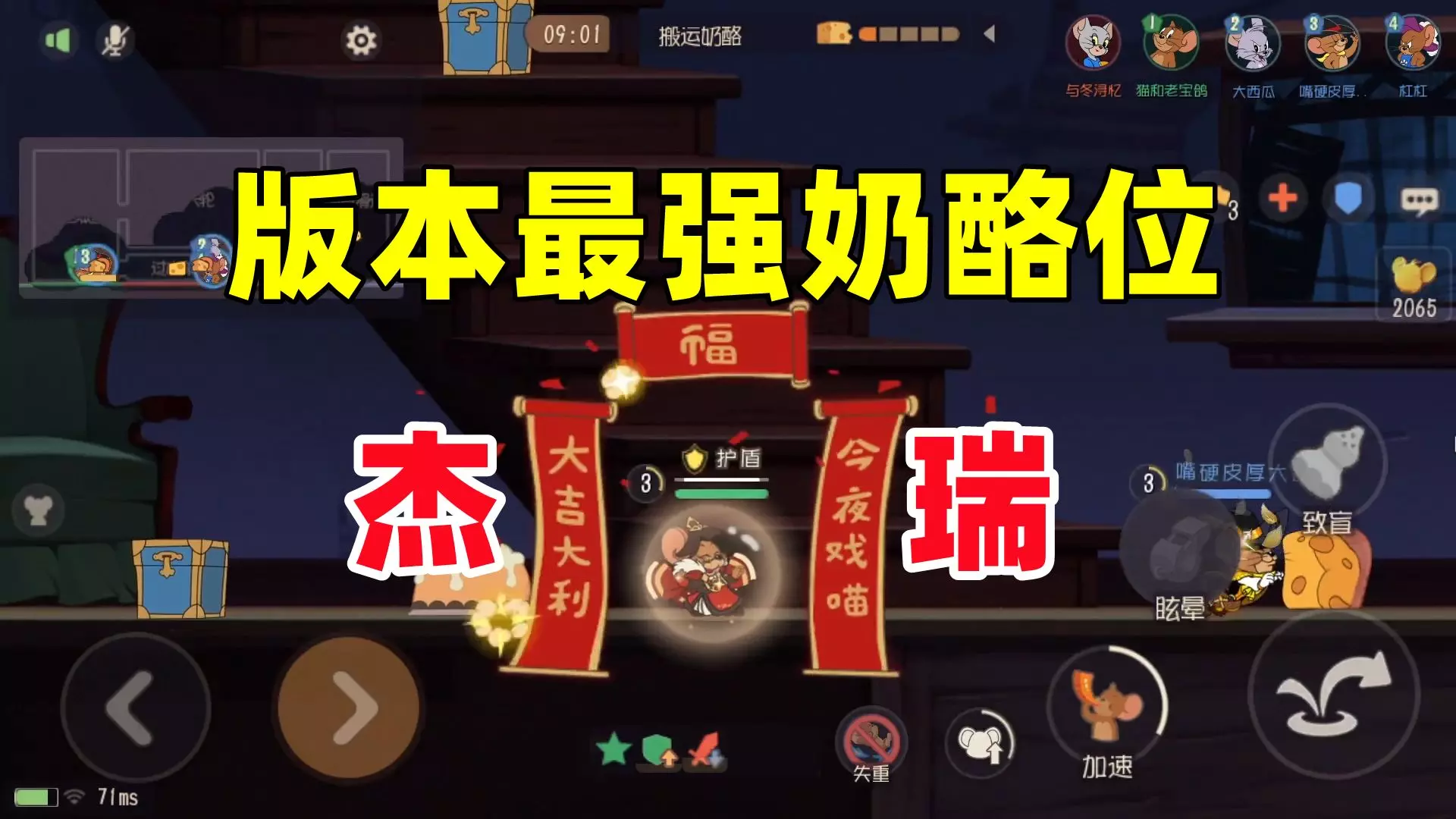 这是《猫和老鼠手游》的游戏实况,针对难对付的猫角色如玉,展示了使用格挡剑杰来应对的实战操作,呈现了剑杰的格挡等技能在对局中的运用,帮助玩家应对如玉。